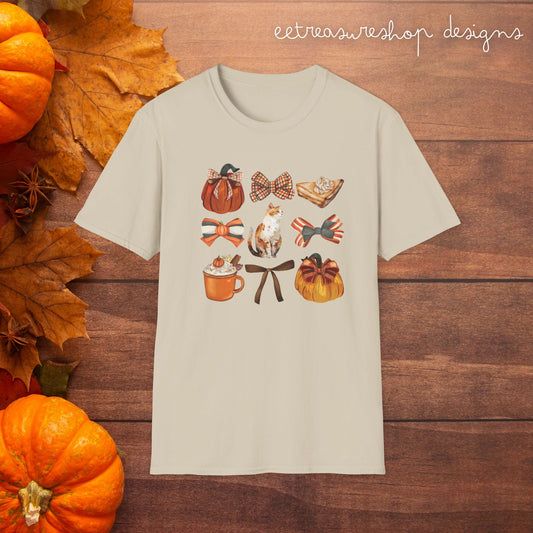 Cat Thanksgiving T-Shirt, Autumn Bows Tee, Fall Holiday Shirt, Cute Kitten Top, Softstyle Tee for Friendsgiving