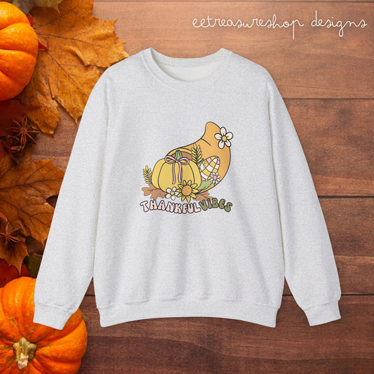 Thankful Vibes Thanksgiving Sweatshirt, Cute Crewneck Jumper, Fun Unisex Pullover, Gratitude Gift, Cozy Fall Apparel