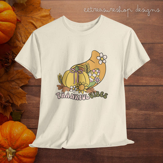 Thankful Vibes Unisex Heavy Cotton Tee, Pumpkin Bow Autumn Tshirt, Cute Thanksgiving Shirt, Fall Graphic Top, Grateful Tee, Harvest Festival